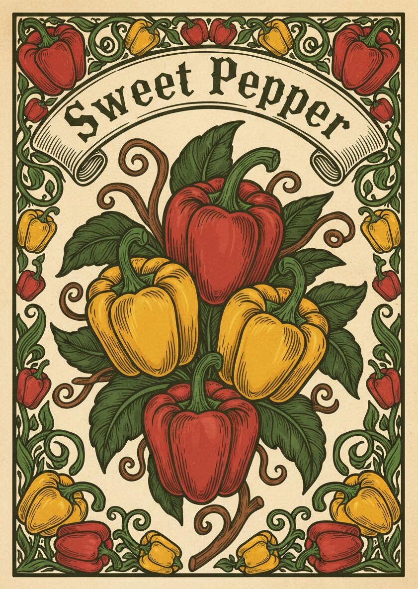 This illustration presents a central cluster of red and yellow bell peppers with green leaves. The color palette includes red, yellow, and green hues. A decorative border of peppers and vines surrounds the central image, and a banner with text appears at the top.